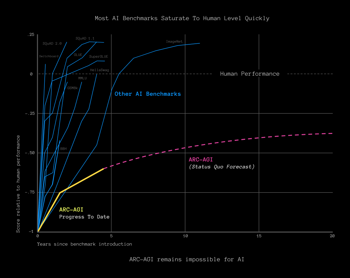 ARC-AGI is not saturating, in fact current pace is slowing down. It was designed to resist memorization and has proven extremely challenging for both the largest foundational transformer models as well as bespoke AI systems designed to defeat ARC-AGI.